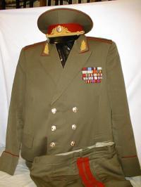 walking out uniform. Jacket,pants,visor.Grey jacket has red piping and gold embroidery on collar and around cuffs,shoulder boards are gold with red underlay and has the large embroidered gold Marshal star with embroidered Soviet coat of arms,large ribbon bar.Pants are dark blue with red generals stripes.Grey visor with red band and red piping with gold embroidery. $1,500 |
